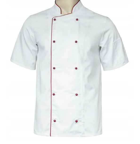 Bluza kucharska o kroju uniwersalnym, z krótkim rękawem. Bluza posiada lamówkę w kolorze bordowym. Zapinana na 10 guzików kulkowych (5 rzędów). Doskonała dla kucharzy, kelnerów i w szeroko pojętej gastronomii.