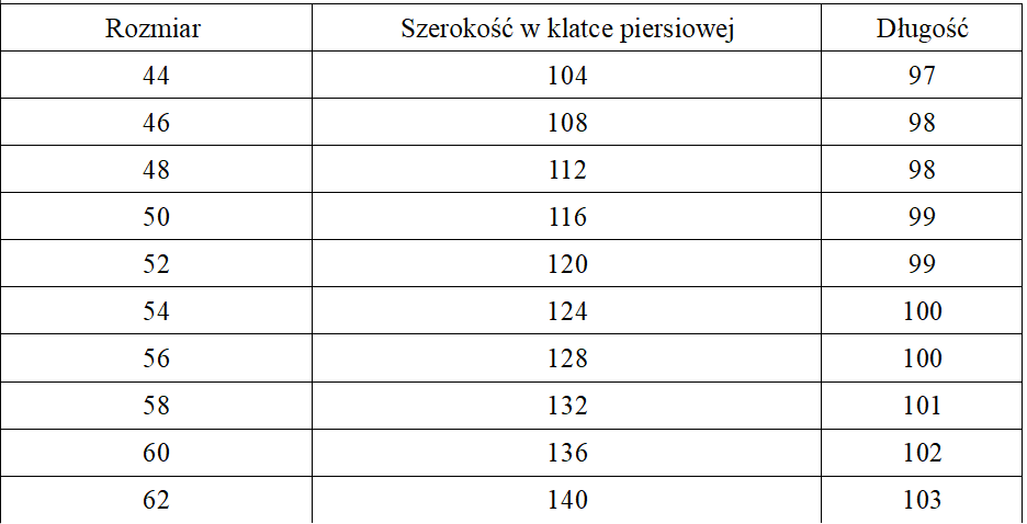 Tabela rozmiarów: