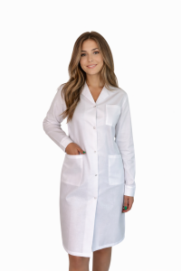 Klasyczny biały fartuch, wykonany w 100% z bawełny. Wygodne zapięcie na napy, praktyczne kieszenie, idealny do laboratoriów, szkół, pracowni czy gabinetów.