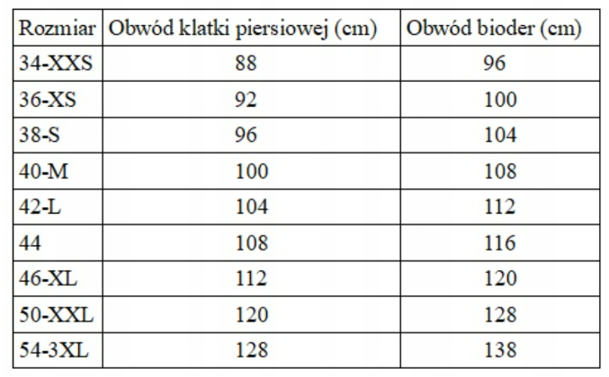 Tabela rozmiarów: