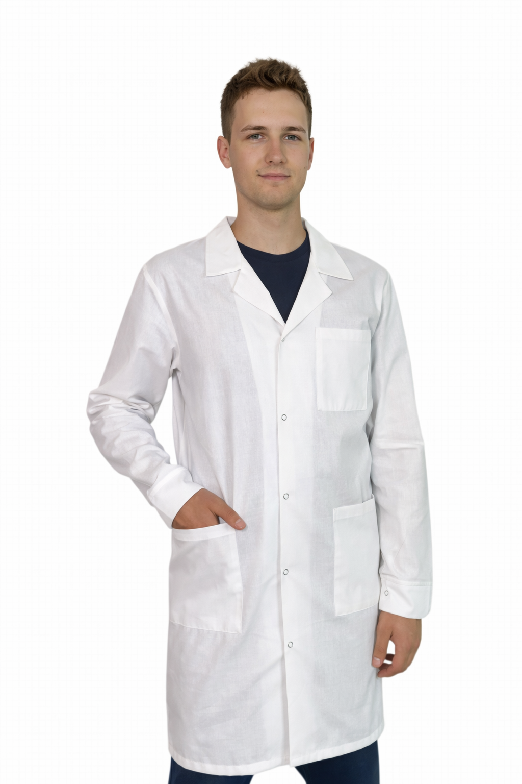 Klasyczny biały fartuch, wykonany w 100% z bawełny. Wygodne zapięcie na napy, praktyczne kieszenie, idealny do laboratoriów, szkół, pracowni czy gabinetów.